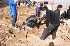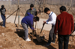 上午7:50全体师生在指定地点集合,同学们手里拿着水桶、水瓢、铁锹等各种植树工具,兴致勃勃的等待着。8:00整,植树活动正式开始。首先,由老师亲自为同学们示范栽种树苗的技巧,娴熟的动作让同学们钦佩不已。随后,在老师的指导和帮助下,同学们分工合作:挖坑、种树、填土、浇水,活动进行的井然有序。虽然土地十分的坚硬、石头非常的多,但同学们依旧热情不减,依然干劲十足。最终,经过全体师生的共同努力原本荒芜的空地变得生机盎然. 10:00整植树活动结束,此次活动共计植树400余棵。